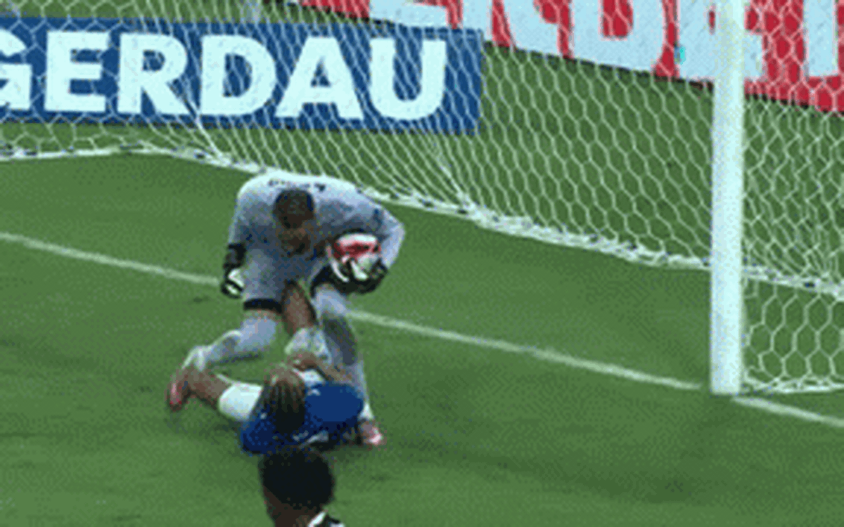 Thủ môn bị đánh văng vào lưới, sau khi... quỳ gối lên người đối thủ đang nằm chấn thương