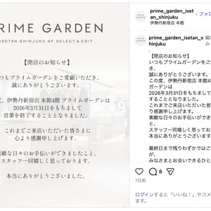 伊勢丹新宿店本館4階の自主編集ショップ「プライムガーデン」が、3月末をもって閉店する。2003年9月のオープン以来、約23年にわたり営業してきた。 このコンテンツは FASHIONSNAP が配信しています。