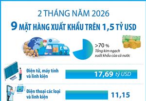 2 tháng năm 2026, có 9 mặt hàng xuất khẩu đạt kim ngạch trên 1,5 tỷ USD, chiếm trên 70% tổng kim ngạch xuất khẩu của cả nước.