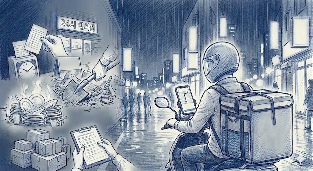 아프신 어머니와 단둘이 산다. 아버지는 내가 중학생일 때 돌아가셨고, 그 이후 집안은 빠르게 가라앉았다. 어머니는 공장 식당에서 오랫동안 밥을 지으셨지만, 무릎 관절염이 심해지면서 그마저도 그만두셔야 했다. 병원에서는 정기적인 치료와 주사, 운동을 권했지만, 현실은 쉽지 않았다. 치료비며 약값, 재활을 위한 장비 비용은 매달 집세보다 더 큰 부담이었다. 나는 대학에 가지 않았다. 수능도, 입학원서도, 친구들과의 졸업사진도 없이 고등학교를 마쳤다. 그게 빠른 선택이라고 믿었다. 어차피 공부보다는 일이 먼저였으니까. 그 뒤로 나는 일이라고 부를 수 있는 거의 모든 일을 해봤다. 편의점 야간 근무, 막노동, 설거지, 퀵서비스, 중고거래 대행, 행사 알바까지. 몸을 쓰는 일이라도 성실히 하면 뭐라도 남을 줄 알았지만, 현실은 그렇지 않았다. 하루하루가 달라서 돈도 들쭉날쭉했고, 예측 가능한 미래는 없었다. 그러던 중 지인이 말했다. "배달하면 괜찮게 벌 수 있어. 오토바이만 있으면 돼." 플랫폼 앱을 깔면 바로 일할 수 있다는 말에 혹했다. 처음엔 단순히 빠르게 돈을 벌 수 있는 일로 생각했다. 앱을 켜고, 주문을 받고, 음식을 배달지로 가져다주면 된다고 느꼈다. 하지만 금방 깨달았다. 이 일은 단순히 음식을 나르는 것이 아니라 감정까지 함께 실어 나르는 일이라는 것을. 비가 와도 눈이 와도, 오늘도 문 앞에 서는 사람 나는 저녁에서 새벽 시간대에 주로 배달한다. 도시가 조용해질 즈음, 배달은 다시 분주해진다. 도로는 어둡고, 눈은 침침하며, 손끝은 얼어붙는다. 그러나 앱 알림은 쉴 틈 없이 울린다. "빠른 배달 부탁드립니다." "음식 안 식게 해주세요." "벨 누르지 마시고, 노크 세 번만 해주세요." 모든 요청을 따라가려면, 마치 내가 로봇이 된 기분이다. 나는 늘 신호를 지키며 운전한다. 사고가 날까 봐 겁이 나기도 하지만, 무엇보다 내가 다치면 나를 돌볼 사람도, 대신 돈을 벌어줄 사람도 없다. 하지만 신호를 지키고 제시간에 도착해도 욕을 먹는다. 배달이 늦다고. 한 번은 폭우가 쏟아지던 날이었다. 우비를 입었지만 바지는 이미 젖어 있었다. 도로는 미끄럽고, 시야는 흐렸으며 음식은 찌개였다. 살얼음처럼 미끄러운 커브를 돌아 겨우 도착한 집 문 앞에서 고객은 음식 봉투를 열어보더니 말했다. "국물이 조금 샜네요. 안 먹을게요. 환불해주세요." 그리고는 더이상 말도 없이 문이 닫혔다. 멍한 순간이 지나가고 마음을 추스른 뒤, 욕설을 듣지 않은 게 다행이라고 생각하며 다시 헬멧을 쓰고 출발했다. 이 일은 감정의 상처를 안고도 웃어야 하는 직업이다. 실수가 없어도 "죄송합니다"를 먼저 말해야 하고, 욕을 들어도 침착하게 "네, 알겠습니다"를 반복해야 한다. 나는 하루에도 수십 번 "죄송합니다"를 말한다. 그리고 아무도 알아주지 않는다. 전체 내용보기