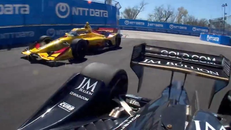 Alex Palou watches on as he can't stop Kyle Kirkwood from passing him by for the lead in the first IndyCar race in Arlington, Texas.