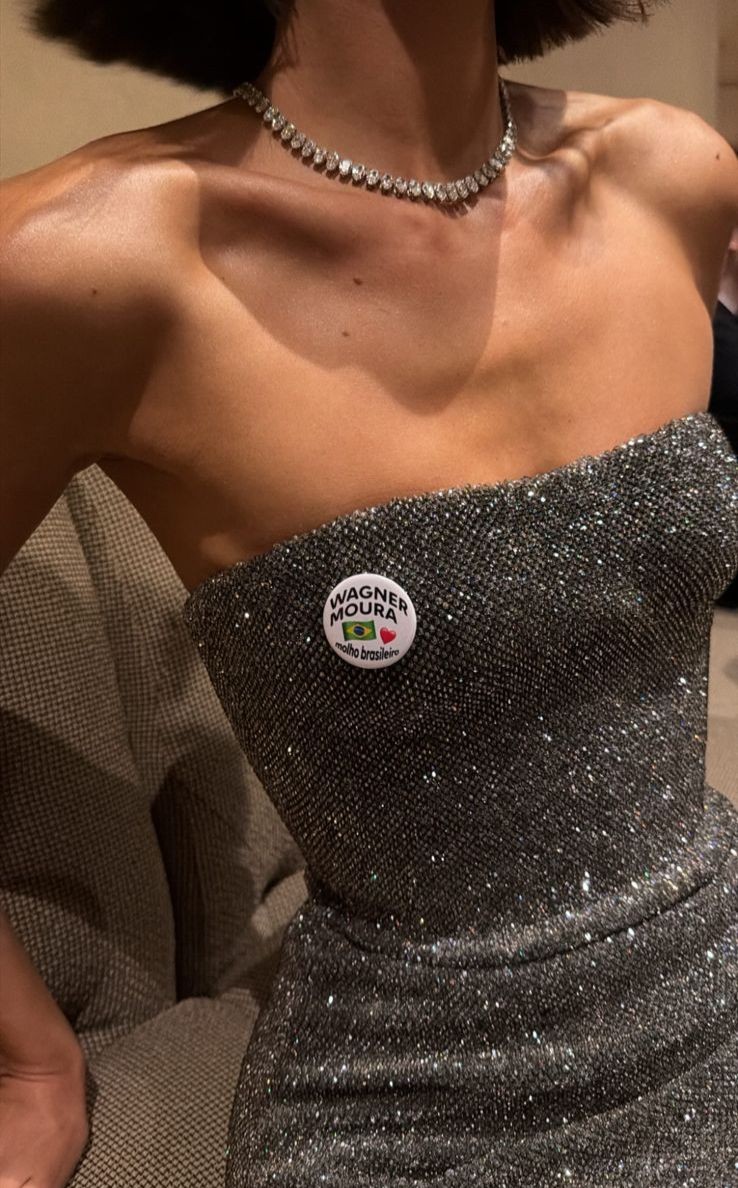 A atriz Bruna Marquezine chamou atenção nas redes sociais ao aparecer usando um broche com o nome de Wagner Moura. O acessório, acompanhado de um detalhe com a bandeira do Brasil , foi interpretado por muitos como uma forma sutil de demonstrar torcida e apoio ao ator brasileiro. Bruna chegou na cerimônia com um vestido sem alça e de tecido brilhante; o modelo é assinado por Demna, à frente da Gucci. Bruna Marquezine no Oscar 2026 Arturo Holmes / GETTY IMAGES NORTH AMERICA / Getty Images via AFP Para o o crítico de moda Dudu Bertholini, o visual da atriz está exuberante: "O vestido sem alça, o cabelo messy, a beleza natural, a colocam num lugar jovial e contemporâneo. É um look que joga seguro. Não ousa, mas tem o tom certo".