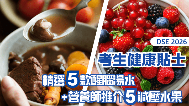 DSE 2026|香港中學文憑試(DSE)即將開考,各位考生正全力備戰。長時間高強度溫習加上考試壓力,容易導致疲勞、作息紊亂,甚至影響身心健康。《星島教育》希望各位考生在追求理想成績的同時,也要留意身體健康。因此搜集中醫食療食譜、作息調整建議,以及營養師的貼士,除推薦5款有益減壓、補腦湯水外,也推介5款減壓水果,助同學保持精力充沛、頭腦清醒,在DSE中發揮最佳水平。 DSE 2026|壓力過大,身