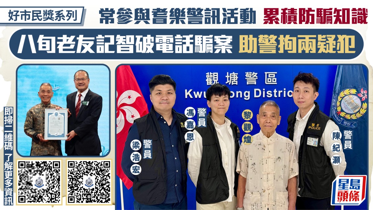 警務處前日(14日)舉行「好市民獎頒獎典禮2025」,嘉許80名協助撲滅罪行、拯救生命的好巿民,並向6間機構頒發「好機構獎」,表揚他們積極支持警方防騙滅罪、維護國家安全和推動青少年發展的工作。現年82歲的黎觀煌是今屆最年長的得獎者,憑藉平日參與「耆樂警訊」活動累積的防騙知識,於去年3月中成功識破一宗「猜猜我是誰」電話騙案。機警的他不但洞悉騙徒伎倆,更主動報警並配合警方「智取」騙徒,協助觀塘警區情報
