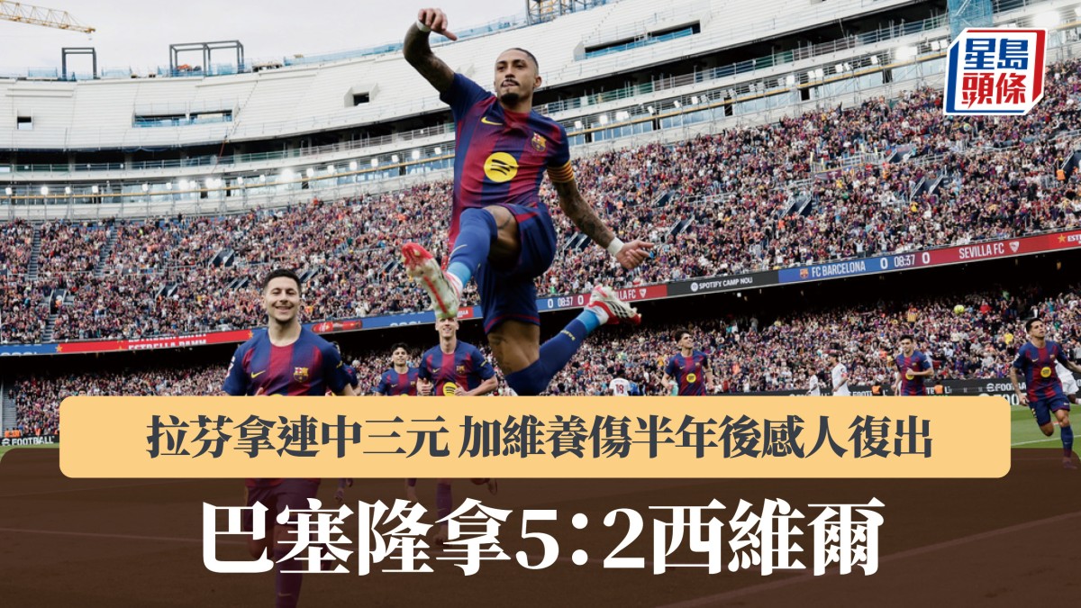 巴塞隆拿昨晚於西甲主場面對西維爾,憑拉芬拿大演「帽子戲法」,以5:2輕取對手。巴塞賽後在聯賽尚餘10輪下,續以4分優勢領先次席的皇家馬德里。 拉芬拿入兩球12碼 開賽僅9分鐘,簡斯路於禁區內被迪積比爾蘇維侵犯,巴塞獲得12碼,由拉芬拿冷靜射入先開紀錄。21分鐘,西維爾後衛卡蒙拿因以手阻擋簡斯路推進,經VAR翻看後巴塞再獲極刑,拉芬拿今次射地波,西維爾門將華卓迪莫斯捉到路照入,巴塞領先2:0。38分