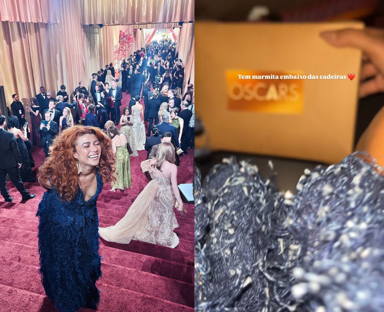 A atriz Geanne Albuquerque, a Elisângela de "O Agente Secreto", mostrou um detalhe da cerimônia do Oscar: uma "marmita" distribuída aos convidados. "Tem marmita embaixo das cadeiras", escreveu ela ao mostrar imagem no Instagram. Na imagem, é possível ver uma caixa de papelão com a marca do Oscar. Mais cedo, a atriz brincou que tentaria mostrar os bastidores, mas que a missão não seria fácil. "Não pega interet lá dentro, é proibido celular, não vou conseguir fazer a linha Selton Mello", disse, em referência ao ator, que fez a linha "bloqueirinho" resgistrando os bastidores da cerimônia no ano passado, quando o filme Ainda Estou Aqui disputou ao Oscar. Atriz mostra marmita no Oscar Instagram Atriz mostra marmita no Oscar Instagram