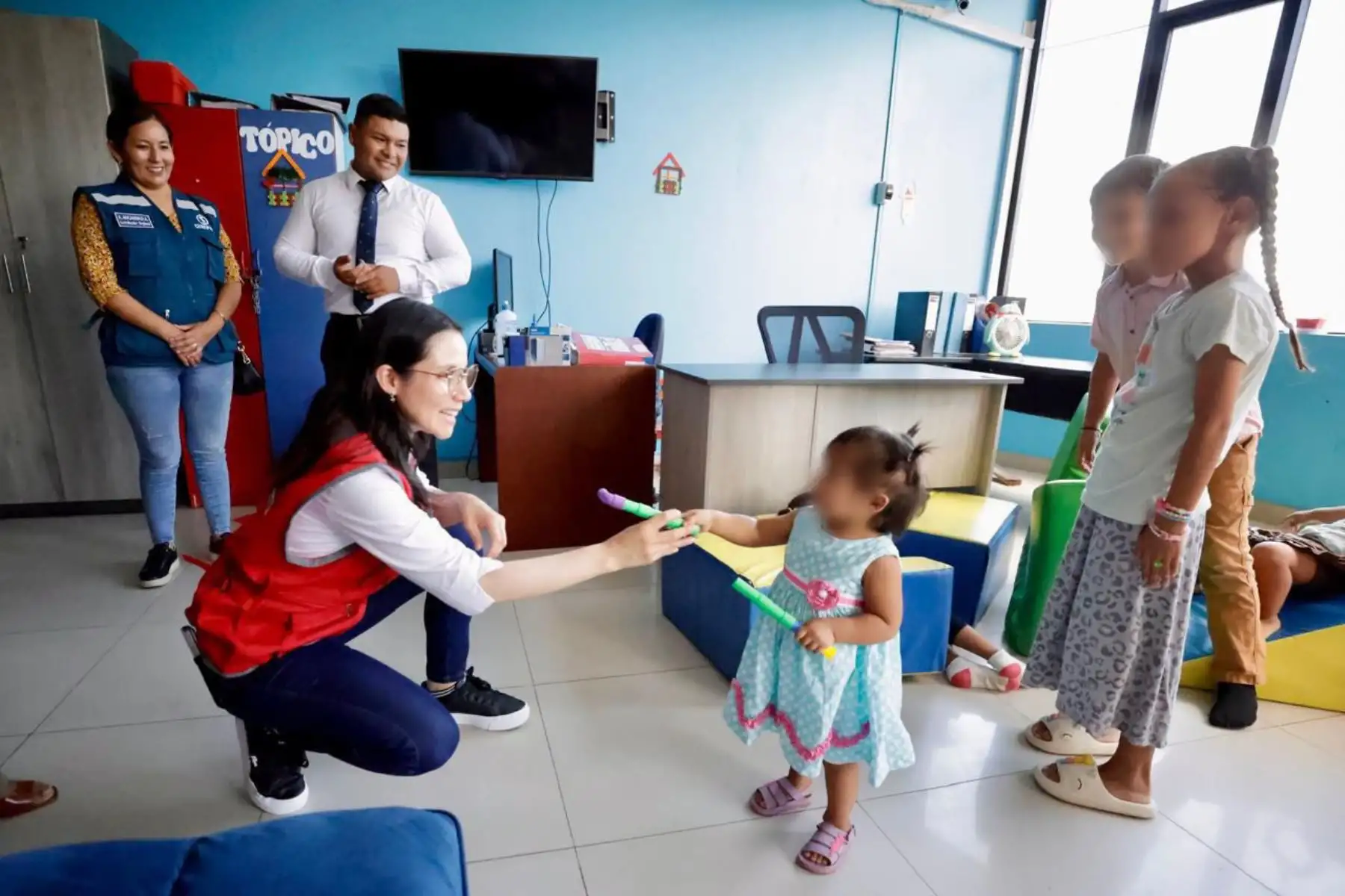 La ministra de la Mujer y Poblaciones Vulnerables, Hary Izarra Trelles, se reunió con una familia acogedora que tiene a cargo a dos niñas de 5 años y 10 meses de nacida, con el objetivo de corroborar la calidad de atención que las menores mientras se encuentran en custodia temporal.