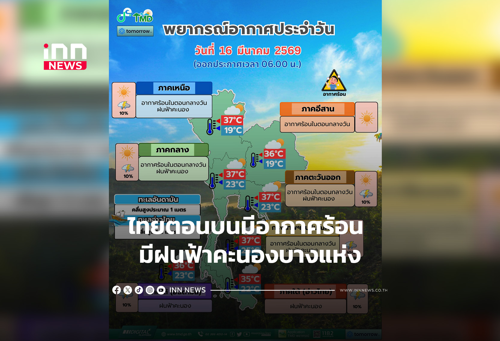 ประเทศไทยตอนบนมีอากาศร้อน ตอนกลางวัน และมีฝนฟ้าคะนองบางแห่ง กรุงเทพปริมณฑลฝน ร้อยละ 10