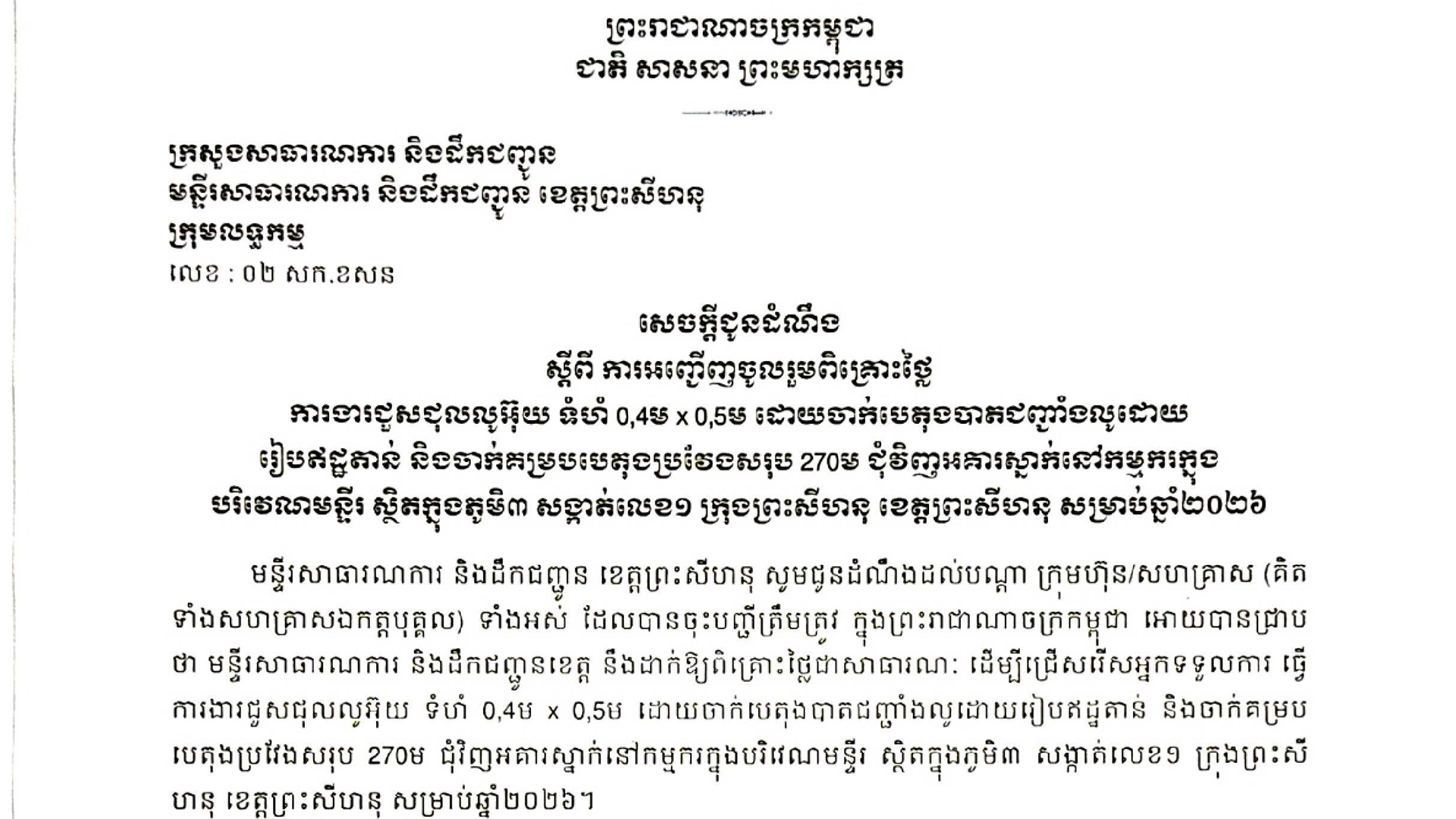 The post សេចក្ដីជូនដំណឹងស្ដីពី ការអញ្ជើញចូលរួមពិគ្រោះថ្លៃ ការងារជួសជុលលូអ៊ុយ ទំហំ 0,4 ម៉ែត្រ x 0,5 ម៉ែត្រ appeared first on Kampuchea Thmey Daily .