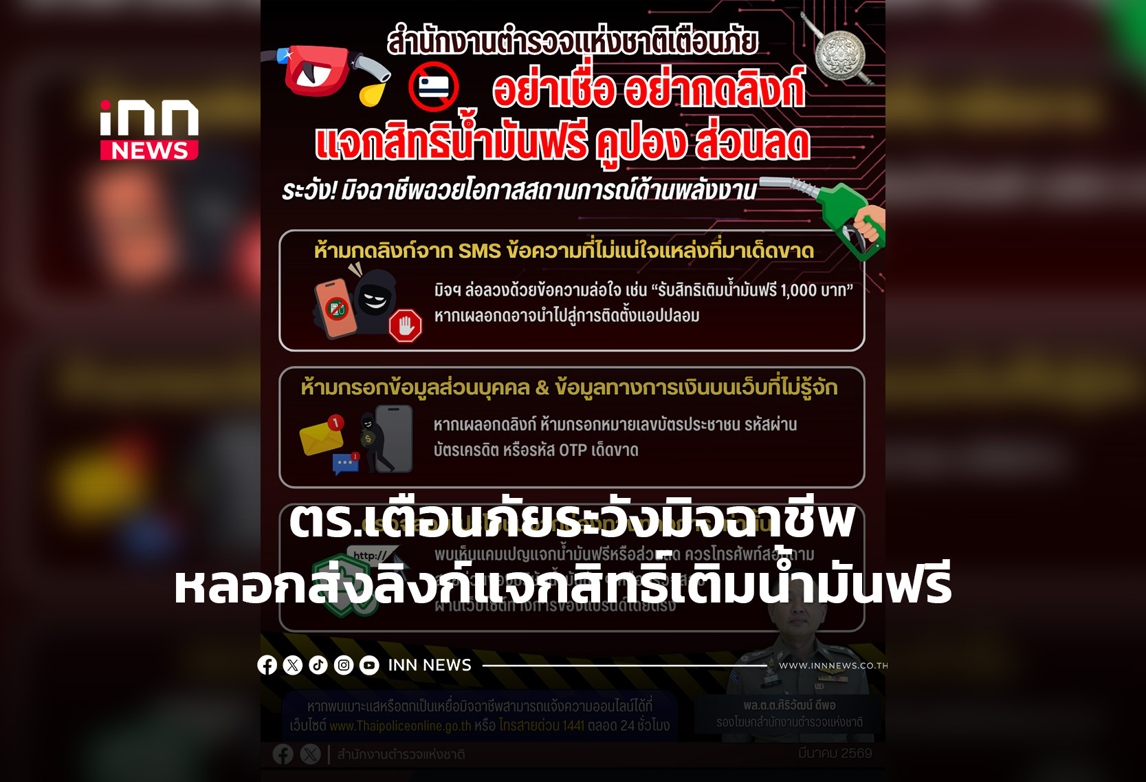 สำนักงานตำรวจแห่งชาติเตือนภัย มิจฉาชีพฉวยวิกฤตพลังงาน ส่งลิงก์หลอกแจกสิทธิ์เติมน้ำมันฟรี