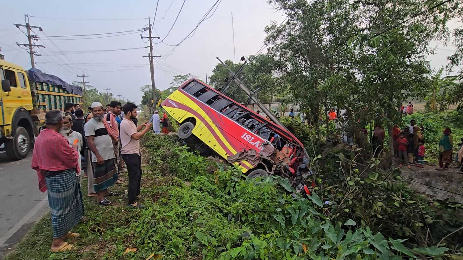 বরিশাল-কুয়াকাটা মহাসড়কের বাকেরগঞ্জে ট্রাকের সঙ্গে মুখোমুখি সংঘর্ষে ‘ইসলাম পরিবহন’ নামের একটি যাত্রীবাহী বাস নিয়ন্ত্রণ হারিয়ে খাদে পড়ে গেছে। সোমবার (১৬ মার্চ) ভোরে বাকেরগঞ্জ ফায়ার সার্ভিস স্টেশন সংলগ্ন এলাকায় এই দুর্ঘটনা ঘটে।দুর্ঘটনায় বাসের অন্তত ১০ জন যাত্রী আহত হয়েছেন। আহতদের মধ্যে মাসুদুর রহমান নামে একজনের অবস্থা অত্যন্ত আশঙ্কাজনক। তাকে উন্নত চিকিৎসার জন্য বরিশাল শের-ই-বাংলা মেডিকেল কলেজ (শেবাচিম) হাসপাতালের নিবিড় পর্যবেক্ষণ কেন্দ্রে (আইসিইউ) ভর্তি করা হয়েছে। আরও পড়ুন: সিলেটে সড়ক দুর্ঘটনায় পুলিশ সদস্য নিহত ফায়ার সার্ভিস ও স্থানীয় সূত্রে জানা যায়, ভোরে কুয়াকাটাগামী বাসটির সঙ্গে বিপরীতমুখী একটি ট্রাকের সংঘর্ষ হলে বাসটি সড়কের পাশে খাদে পড়ে যায়। খবর পেয়ে ফায়ার সার্ভিস কর্মীরা দ্রুত ঘটনাস্থলে পৌঁছে উদ্ধার অভিযান শুরু করেন।