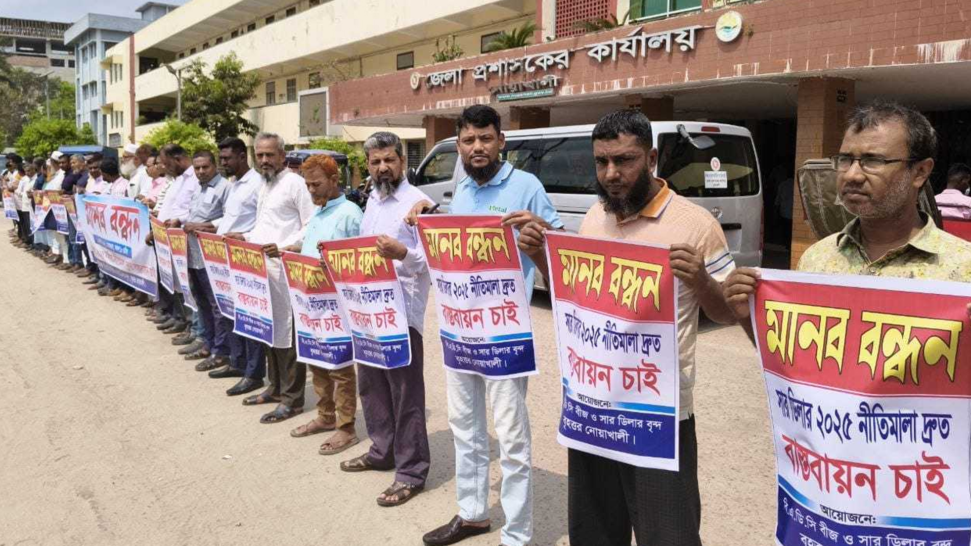 ‘সার নীতিমালা ২০২৫’ দ্রুত ও কার্যকরভাবে বাস্তবায়নের দাবিতে নোয়াখালীতে মানববন্ধন করেছে বিএডিসি বীজ ও সার ডিলার সমিতি।সোমবার (১৬ মার্চ) বেলা ১২ টায় জেলা প্রশাসকের কার্যালয়ের সামনে এ কর্মসূচির করা হয়। মানববন্ধনে বক্তারা বলেন, গত বছরের ১৬ নভেম্বর সরকার যুগোপযোগী এই নীতিমালা অনুমোদন করলেও চার মাস পেরিয়ে গেলেও এর বাস্তবায়ন শুরু হয়নি। নীতিমালাটি কার্যকর হলে ওয়ার্ড পর্যায়ে ডিলার নিযুক্ত করে কৃষকের দোরগোড়ায় সাশ্রয়ী মূল্যে সার পৌঁছে দেয়া সম্ভব হবে। এতে সারের কৃত্রিম সংকট ও অসম বিতরণ রোধ হবে এবং দুর্নীতিপরায়ণ মহলের ডিলারশিপ বাতিল হয়ে প্রকৃত কৃষক উপকৃত হবেন। আরও পড়ুন: নোয়াখালীতে রাতের আঁধারে মুকুলসহ ২০টি আম গাছ কেটে দিলো দুর্বৃত্তরা বক্তারা উদ্বেগ প্রকাশ করে বলেন, একশ্রেণির স্বার্থান্বেষী ও দুর্নীতিবাজ ডিলার চক্র নীতিমালা বাস্তবায়নে নানা বাধা সৃষ্টি করছে। এর ফলে কৃষকরা সময়মতো ও নির্ধারিত মূল্যে সার পাচ্ছেন না।সংগঠনের সাধারণ সম্পাদক ইসমাইল হোসেন খানের সঞ্চালনায় বক্তব্য রাখেন জেলা সভাপতি কৃষিবিদ মোজাম্মেল কবির, লক্ষ্মীপুরের সাধারণ সম্পাদক ইকবাল হোসেন, কৃষিবিদ মাইন উদ্দিন প্রমুখ। এ সময় নেতৃবৃন্দ নীতিমালা দ্রুত কার্যকর করে প্রতিটি ডিলারকে সার সরবরাহের নির্দেশনা দেয়ার জোর দাবি জানান। আরও পড়ুন: নোয়াখালীতে অস্ত্র ঠেকিয়ে শিক্ষকের বাসায় ডাকাতি পরে কৃষি মন্ত্রণালয়ের সচিব, বিএডিসির মহাপরিচালক এবং নোয়াখালী জেলা প্রশাসক বরাবর স্মারকলিপি প্রদান করা হয়।