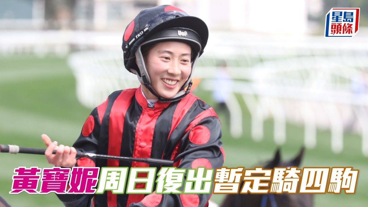 見習騎師黃寶妮在去年十一月二十三日沙田賽事第五場開跑前的一宗閘廂事件中右腿受傷, 經過治療和休息後,星期日終於可以復出。 黃寶妮周日復出戰暫時卜定「綫路滿貫」,「君子」、「行運加持」及「進傲星」。 陳嘉甜
