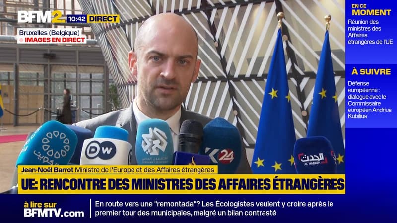 Jean-Noël Barrot, ministre de l'Europe et des Affaires étrangères a pris la parole face à la presse, ce lundi 16 mars, avant la réunion des ministres des Affaires étrangères de l'Union européenne, à Bruxelles.