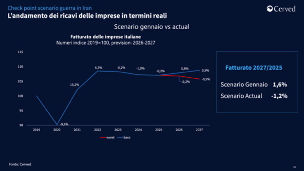 Una crisi prolungata e un nuovo shock energetico potrebbero portare la congiuntura economica italiana alla stagnazione nel triennio 2026-28. Il Termometro Italia di MBS Consulting rileva un'impennata delle preoccupazioni delle famiglie mentre Cerved Rating Agency stima un aumento della probabilità di default delle imprese del 22% in caso di shock energetico simile al 2022 L'attacco di Stati Uniti e Israele all'Iran genera gravi tensioni nell'area mediorientale e delinea un nuovo scenario macroeconomico internazionale, con immediati riflessi sull'economia italiana. Cerved , attraverso l'analisi dei dati e utilizzando i suoi modelli econometrici, ha rilevato che la stagnazione dell'economia e la contrazione dei ricavi delle imprese potrebbero concretizzarsi già nell'anno in corso. Cerved Rating Agency ha stimato un aumento della probabilità di default delle imprese del 22% nel caso in cui lo shock energetico fosse simile a quello verificatosi nel 2022. MBS consulting ha effettuato una rilevazione straordinaria del Termometro Famiglie mostrando un'impennata della preoccupazione delle famiglie in merito al contesto socioeconomico. Lo scenario macroeconomico di Cerved La nuova analisi Cerved incorpora gli effetti del recente attacco di Stati Uniti e Israele all'Iran e dell'estensione del conflitto mediorientale su scala regionale: aumento del prezzo di petrolio e gas naturale: con conseguente incremento delle tensioni inflazionistiche sia nell'area euro che in Italia, entrambe fortemente dipendenti dalle forniture estere di gas e oil. potenziale disruption della supply chain: alcune filiere potrebbero subire rallentamenti o fermarsi del tutto a causa del mancato transito delle forniture nello stretto di Hormuz. chiusura del ciclo espansivo della Banca Centrale Europea: a fronte del rischio di un aumento dei prezzi la BCE potrebbe aumentare i tassi già nel corso del 2026. Tutte queste dinamiche renderebbero più fragile la congiuntura economica italiana rendendola di fatto ferma nel triennio previsivo 2026-2028. Le cause sono da ricercare da un lato nell'indebolimento dei consumi privati, penalizzati dai nuovi rincari delle bollette energetiche e dei carburanti, dall'altro dalla stabilizzazione degli investimenti pubblici, che negli ultimi anni avevano contribuito in maniera significativa alla crescita grazie ai bonus edilizi e al PNRR. Le tensioni internazionali e la chiusura delle rotte mediorientali avrebbero un impatto anche sul commercio internazionale, già colpito dai dazi statunitensi, e porterebbero al calo sia dell'import che dell'export italiano. Le imprese potrebbero quindi subire una contrazione dei fatturati reali. Nello scenario attuale, i ricavi reali si porterebbero in area negativa, con una flessione del -0,2% nel 2026 e del -0,9% nel 2027. Il risultato complessivo nel biennio 2026-2027 risulterebbe in calo del -1,2% rispetto al 2025. Stretto di Hormuz: gli impatti della crisi sui settori La crisi geopolitica nell'area del Golfo e il blocco dello Stretto di Hormuz stanno generando impatti immediati e trasversali sull'economia italiana, con ripercussioni differenziate tra settori produttivi, filiere industriali e comparti dei servizi. Aumento dei costi degli input energetici: rincari di gas naturale, petrolio, combustibili industriali e energia elettrica stanno colpendo in modo particolarmente severo i settori più esposti dal punto di vista degli input energetici e chimici: settori dipendenti dal gas: ceramica, piastrelle, carta, vetro, cemento e materiali da costruzione, laterizi, fonderie; settori petrolio‑dipendenti: raffinazione, chimica, plastica e gomma; power generation e filiera energetica; trasporti aerei, marittimi, autotrasporto; agricoltura, soprattutto per l'aumento del costo dei fertilizzanti e dei carburanti agricoli. 2. Gravi problemi logistici e interruzioni della supply chain. Il blocco dello Stretto di Hormuz e la deviazione del traffico marittimo internazionale determinano ritardi, costi aggiuntivi e difficoltà di approvvigionamento per filiere critiche: trasporti marittimi e aerei, con ripercussioni sulla logistica nazionale e internazionale; fertilizzanti e mangimi, con effetti sull'agroalimentare; microchip e componentistica elettronica, fondamentali per automotive e meccanica; prodotti del sistema moda (tessuti, filati, accessori, packaging), fortemente dipendenti da catene del valore asiatiche. 3. Impatto immediato sul fatturato dei servizi legati alla mobilità e al turismo. La combinazione tra costi più elevati, instabilità delle rotte e incertezza della domanda globale genera una contrazione significativa dei ricavi nei servizi turistici: trasporti aerei passeggeri, aeroporti, agenzie viaggio e tour operator; alberghi, strutture ricettive, ristorazione, shopping tourism, crociere e viaggi organizzati La crisi nello Stretto di Hormuz si configura come uno shock energetico, logistico e di domanda che interessa simultaneamente industria, servizi e filiere. Le imprese italiane si trovano ad affrontare un quadro caratterizzato da aumento dei costi, interruzioni nelle forniture, pressioni sui ricavi e rallentamento dei consumi. Cerved Rating Agency, approfondimento sul rischio di credito A seguito dello shock energetico derivante dal conflitto ucraino, la probabilità di default (PD) media delle imprese con rating emesso da Cerved Rating Agency aumentò in modo significativo e raggiunse il livello massimo da un decennio. L'aumento dei prezzi dell'energia aggravò, infatti, una situazione già complessa per le imprese, provate dai mesi difficili trascorsi durante la pandemia di Covid. Partendo da un livello di probabilità di default medio attuale, uno shock energetico simile a quello del 2022 con conseguente inasprimento della politica monetaria potrebbe tradursi in un aumento della PD di circa il 22%, sfiorando i livelli del 2023, con un impatto significativo soprattutto per i settori energy-intensive. Tuttavia, va puntualizzato che rispetto al