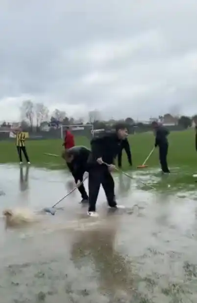 Yoğun yağış nedeniyle oluşan su birikintilerini taraftar ve görevliler temizledi