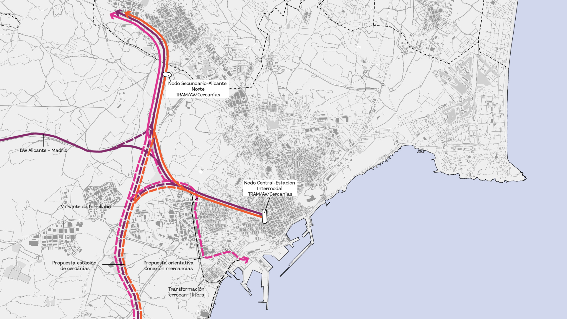 El Ayuntamiento de Alicante ha presentado una de las líneas estratégicas de su futuro Plan General Estructural (PGE): la creación de un segundo nodo intermodal en la ciudad. Este nuevo punto de conexión, bautizado como Alicante Norte, se ubicará en el entorno de la parada de Cercanías de la Universidad de Alicante y servirá de apoyo a la futura Estación Intermodal central. La propuesta se enmarca en el borrador del Plan General Estructural, el documento urbanístico más importante de los últimos 39 años, que definirá el desarrollo social y económico de Alicante para los próximos 20 años. El equipo de Gobierno del alcalde Luis Barcala ha abierto un proceso de participación ciudadana para debatir el borrador, con una mesa temática específica sobre movilidad que abordará esta estrategia ferroviaria. Según el concejal de Urbanismo, Antonio Peral, el objetivo es ambicioso y busca "dotaremos a Alicante de las infraestructuras necesarias para convertirla en el gran nodo de movilidad regional, apostando por la intermodalidad y el transporte público y reduciendo el tráfico privado". Peral ha destacado que la meta es un "transporte público reforzado que dé servicio a los alicantinos y al entorno metropolitano" para "reducir la presencia del tráfico privado en el casco urbano y el frente litoral". La estrategia define un sistema bicefálico. Por un lado, el Nodo Central o Estación Intermodal, que se ubicará en el entorno de la actual estación de Renfe para integrar Cercanías, Alta Velocidad, la estación central del TRAM y una nueva terminal de autobuses. Por otro, el nodo secundario, Alicante Norte, que conectará Cercanías, el Tren de la Costa y servicios de largo recorrido con la red de tranvía, y se vinculará con la futura ronda metropolitana de la A-70. Además, está previsto que ambos nodos cuenten con conexión directa al aeropuerto. El concejal ha subrayado el compromiso del plan con esta visión: "apostamos en el Plan General Estructural por dotar a Alicante con las infraestructuras de movilidad necesarias, entre los que destacan la Estación Intermodal, que será la principal, y el nodo secundario Alicante Norte, que le servirá de apoyo". La estrategia ferroviaria se complementa con una nueva parada de Cercanías para las áreas industriales, la Variante de Torrellano para unificar tráficos y un nuevo acceso ferroviario al Puerto que liberará el trazado actual para crear un corredor verde.