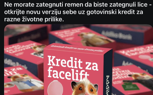 Najnovija promotivna kampanja Addiko banke, kojom se građanima nudi „gotovinski kredit za facelifting“, naišla je na podijeljene reakcije javnosti. Dok banka pokušava privući klijente humorističnim pristupom, korisnici na društvenim mrežama, posebice na Redditu, ne skrivaju nevjericu i postavljaju pitanja o društvenim normama i financijskoj odgovornosti. Reklama, koja se proteklih dana intenzivno pojavljuje na digitalnim platformama, […] Objava Banka šokirala Hrvate oglasom: ‘Ljudi pa kakva je ovo reklama?!’ pojavila se prvi puta na Dnevno.hr .