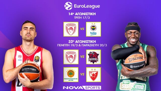 Novasports: Οι εντός έδρας μονομαχίες του Ολυμπιακού με Φενέρμπαχτσε Μπασκόνια, Παναθηναϊκός AKTOR - Ερυθρός Αστέρας και ρεβάνς EuroCup για την φάση των "16"