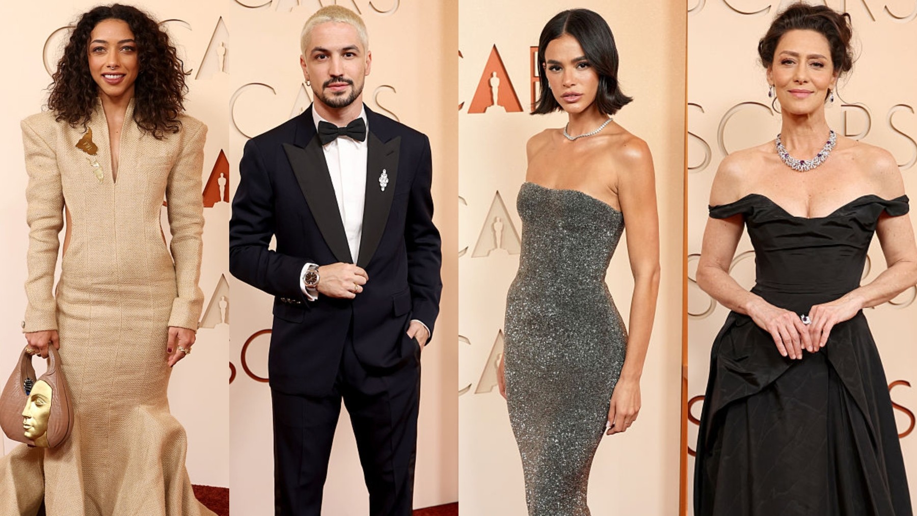 A presença brasileira no tapete vermelho do Oscar ganhou novos contornos em 2026. Em um ano em que o país voltou a disputar espaço entre as principais categorias da premiação, artistas também chamaram atenção pelo estilo no red carpet da 98ª edição da cerimônia, realizada no Teatro Dolby, em Los Angeles. Entre silhuetas clássicas, alfaiataria refinada e criações autorais de estilistas brasileiros, nomes como Bruna Marquezine, Maria Fernanda Cândido, Alice Carvalho e Gabriel Leone apostaram em looks que dialogam com tendências atuais do tapete vermelho e também com a valorização da moda nacional. Ombros em alta: vestidos sem alça são protagonistas no Oscar 2026 Sabe o que é plumaceria? Categoria da alta-costura marca presença no red carpet do Oscar 2026 O momento é simbólico. O Brasil chegou à premiação com cinco indicações: quatro para o filme "O Agente Secreto" — nas categorias de Melhor Filme, Melhor Filme Internacional, Melhor Elenco e Melhor Ator, com Wagner Moura — e uma indicação de Melhor Fotografia para Adolpho Veloso. No clima de celebração do cinema nacional, o red carpet também virou vitrine para escolhas de moda que equilibram tradição, personalidade e narrativa. Conhecida pela elegância discreta em aparições públicas, Maria Fernanda Cândido apostou em um visual que reafirma essa estética. A atriz, que interpreta Elza em "O Agente Secreto", surgiu com um vestido preto da maison Vivienne Westwood. A peça combinava corset estruturado e saia ampla, criando uma silhueta clássica que remete ao glamour hollywoodiano tradicional. Maria Fernanda Candido Getty Images O modelo segue uma tendência recorrente nos grandes tapetes vermelhos: vestidos com construção arquitetônica e cintura marcada, que valorizam o corpo sem abrir mão da dramaticidade. O decote ombro a ombro reforça o ar atemporal do look, enquanto as joias adicionam brilho pontual ao conjunto. Já Bruna Marquezine apostou em uma estética mais minimalista, mas igualmente impactante. A atriz surgiu com um vestido tomara que caia inteiramente bordado em brilho prateado, de silhueta ajustada e linhas limpas, reforçando a tendência de vestidos "segunda pele" que têm dominado os eventos de gala. Bruna Marquezine Getty Images O visual foi desenvolvido sob medida pela casa italiana Gucci. O corte reto e o comprimento alongado criam um efeito elegante e contemporâneo, enquanto o styling com cabelo curto e polido ajuda a destacar a simplicidade sofisticada do look. Moda brasileira em evidência Entre os destaques da noite esteve também Alice Carvalho, que levou uma marca brasileira ao tapete vermelho do Oscar. A atriz escolheu um vestido bege estruturado da grife Normando, com silhueta ajustada e barra em gomos, que cria movimento e volume na parte final da peça. Alice Carvalho Getty Images O vestido levou cerca de 100 horas para ser produzido e trazia um broche em homenagem à América Latina. O styling foi complementado por uma bolsa do modelo Carvalho, assinada pelo estilista brasileiro Jay Boggo em parceria com o estúdio Future Factory, do designer Marcelo Pasqua. A escolha reforça uma tendência crescente entre artistas brasileiros: valorizar a moda autoral nacional em eventos internacionais. Alfaiataria com personalidade Na ala masculina, Gabriel Leone apostou em um clássico renovado. Embaixador da Louis Vuitton, o ator surgiu com um smoking tradicional complementado por um broche de pedras aplicado na lapela. O detalhe trouxe personalidade à alfaiataria, seguindo uma tendência cada vez mais presente nos red carpets: o uso de acessórios como elemento de destaque nos looks masculinos. O novo visual do ator, agora com os cabelos descoloridos, também chamou atenção e reforçou a proposta contemporânea do styling. Gabriel Leone Getty Images Quem mais representou o Brasil no tapete vermelho A atriz Isabel Zuaa, também integrante do elenco de "O Agente Secreto", apostou em um vestido de barra peplum da estilista brasileira Maria Penha, outra escolha que reforça a presença da moda nacional no evento. Isabel Zuaa Getty Images Já o diretor de fotografia Adolpho Veloso, indicado ao prêmio, optou por um smoking da Zegna, com uma variação contemporânea: no lugar da camisa branca tradicional, ele usou uma peça preta com decote em V. Adolpho Veloso Getty Images Entre os convidados, a atriz Laura Lufési também destacou a moda brasileira ao escolher um vestido da Misci. A peça foi construída a partir de quadrados de crepe de acetato com viscose cortados e montados manualmente, revelando diferentes texturas e técnicas artesanais. Laura Lufési Getty Images