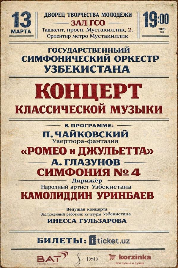 В зале Дворца творчества молодёжи в Ташкенте прошёл концерт Государственного симфонического оркестра Узбекистана под управлением художественного руководителя и главного дирижёра коллектива, Народного артиста Республики Узбекистан Камолиддина Уринбаева. Вечер был посвящён музыке русских композиторов – той самой, где симфоническое звучание умеет говорить о самых сильных человеческих чувствах: любви, судьбе, внутренней борьбе. Открыл концерт один из самых проникновенных […] Сообщение Поэзия симфонического звучания: о концерте Государственного симфонического оркестра Узбекистана появились сначала на Новости Узбекистана сегодня: nuz.uz .