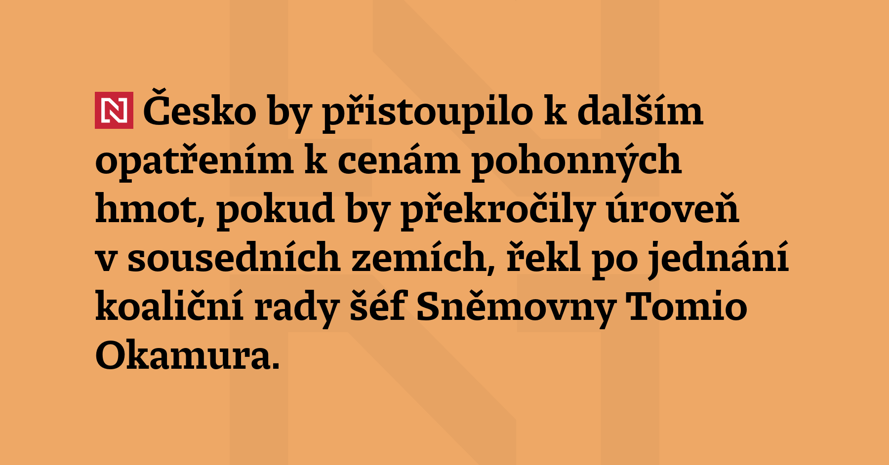 Česko by přistoupilo k dalším opatřením k cenám pohonných hmot, pokud by překročily úroveň v sousedních zemích, řekl po jednání koaliční rady šéf Sněmovny Tomio Okamura. (ČT24)