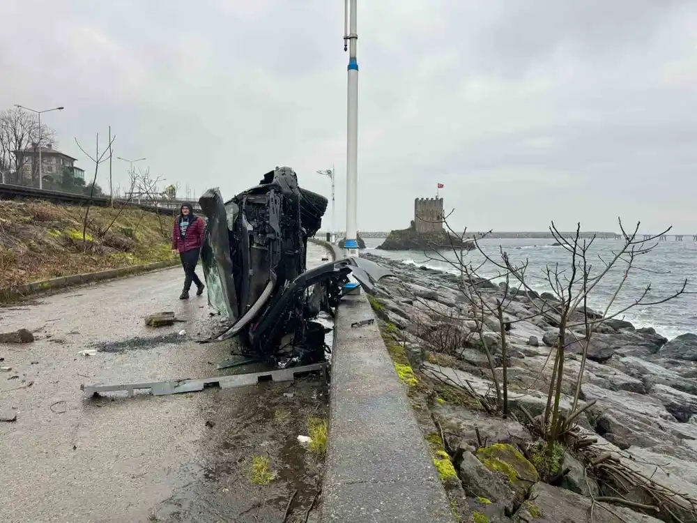 rize’de takla atan otomobil beton bariyere çarparak denize uçmaktan kurtuldu