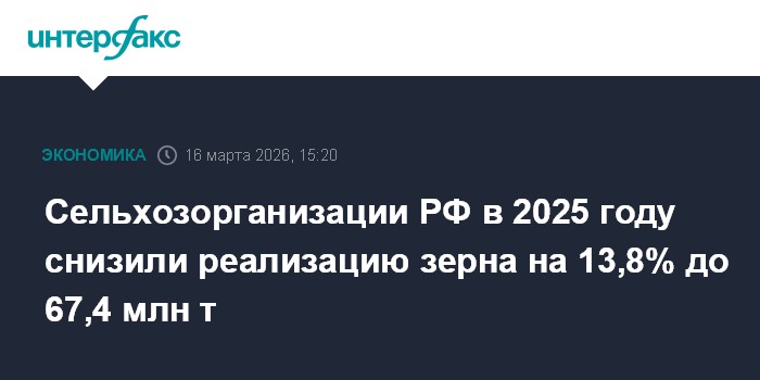 Сельхозорганизации РФ в 2025 году реализовали 67,4 млн тонн зерновых и зернобобовых культур, что на 13,8% меньше, чем в 2024 году (78,3 млн тонн), сообщается в материалах Росстата.