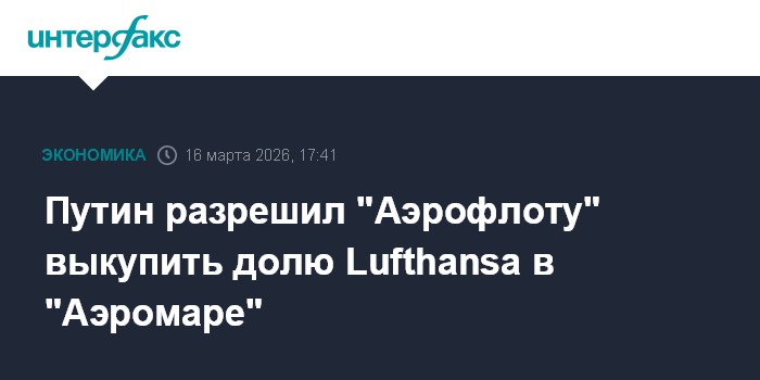 Президент РФ Владимир Путин разрешил "Аэрофлоту" выкупить долю структуры Lufthansa (Германия) в "Аэромаре" - крупнейшей в России компании по производству бортового питания.