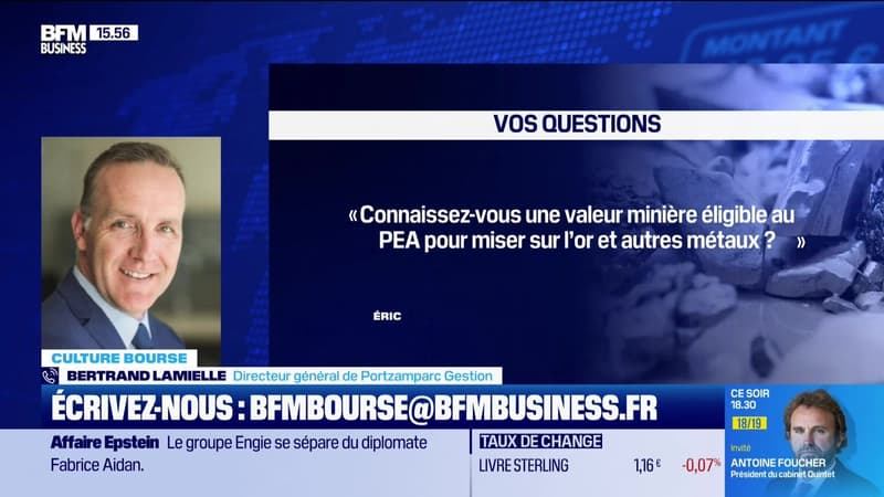 Ce lundi 16 mars, Bertrand Lamielle, directeur général de Portzamparc Gestion, a répondu à la question "Connaissez-vous une valeur minière éligible au PEA pour miser sur l’or et autres métaux précieux ? Par ailleurs, quelles valeurs choisir si on souhaite se diversifier sur les autres métaux plus ordinaires tels que le cuivre, l’acier, l’aluminium ?" dans la chronique Culture Bourse présentée par Gwendal Daubresse-Chasle. BFM Bourse est à voir ou écouter du lundi au vendredi sur BFM Business.