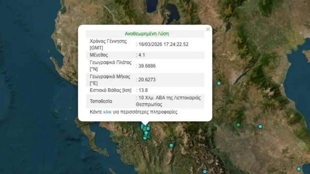 Σεισμός ταρακούνησε την Θεσπρωτία το βράδυ της Δευτέρας 16.03.2026, με μέγεθος 4,1 βαθμούς της κλίμακας Ρίχτερ.