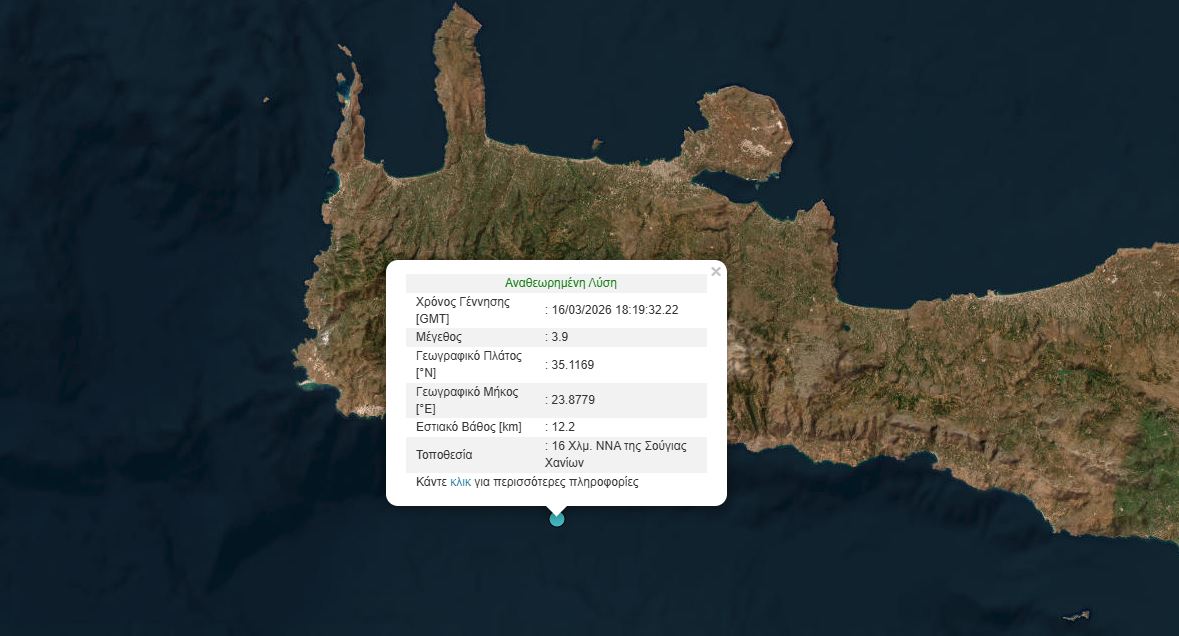Σεισμική δόμηση μεγέθους 3,9 Ρίχτερ σημειώθηκε το απόγευμα της Δευτέρας (16/03) 16 χιλιόμετρα Νότια – Νοτιανατολικά της Σούγιας Χανίων. Ο σεισμός σύμφωνα με το Γεωδυναμικό Ινστιτούτο Αθηνών, είχε εστιακό βάθος 12.2 χιλιομέτρων και έγινε ιδιαίτερα ιδιαίτερα αισθητός μέχρι και την πόλη των Χανίων. www.ertnews.gr