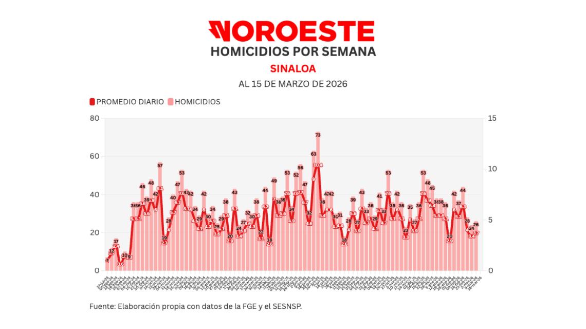 Este domingo 15 de marzo se registraron dos homicidios dolosos en Sinaloa. En Culiacán, una persona fue localizada asesinada en el fraccionamiento Villa Fontana ; y otra más con huellas de violencia en la autopista Mazatlán–Culiacán, en el municipio de San Ignacio. El hallazgo de otro cuerpo ocurrió por la carretera libre, a la altura de la comunidad de Los Chinacates en San Ignacio, pero este no fue incluido como homicidio por la Fiscalía. En otros hechos, la Fiscalía confirmó la liberación con vida de las tres mujeres que habían sido privadas de la libertad en la sindicatura de Bachigualatito, en Culiacán, tras el asesinato de un hombre en el mismo domicilio. También, las autoridades reportaron la vinculación a proceso de un hombre en la colonia Morelos de Culiacán, quien transportaba más de 700 mil dólares en efectivo y de los cuáles no pudo acreditar su origen. Además, dos civiles fuertemente armados fueron detenidos en la colonia La Campiña de Culiacán en posesión de dos vehículos robados. Con estos datos, marzo se proyecta para cerrar con 120 homicidios . El Secretariado Federal no agregó nuevos robos de vehículos pero la Fiscalía agregó una denuncia en la zona centro. Desde que la disputa entre los Guzmán y los Zambada comenzó y que las autoridades no han podido contener, Sinaloa acumula 2 mil 971 asesinatos y 3 mil 507 personas privadas de la libertad . Los saldos de la Ola El balance desde el 9 de septiembre de 2024 hasta el 15 de marzo de 2026 es de: ◉ 2,971 homicidios dolosos (5.4 diarios) ◉ 3,507 personas privadas de la libertad (6.3 diarios) ◉ 10,128 vehículos robados (18.3 diarios) ◉ 3,366 personas detenidas (6.1 diarios) ◉ 170 personas abatidas Hasta ahora, las tres violencias más relevantes para Sinaloa son los homicidios, las privaciones de la libertad y el robo de vehículos. COMPARATIVO DE LOS TRES DELITOS MÁS RELEVANTES Acá puedes ver un comparativo de cómo va el mes de diciembre con respecto a noviembre pasado, así como respecto del promedio enero-agosto de 2024 (previo a la ola de violencia) y de su máximo histórico. Homicidios dolosos Noroeste calcula un promedio móvil diario de 7 días para medir con mayor sensibilidad la evolución del homicidio en Sinaloa. Al día de hoy, el promedio ascendió a 3.7 asesinatos diarios . También Noroeste lleva un conteo mensual de acuerdo a lo registrado por el Secretariado Ejecutivo del Sistema Nacional de Seguridad Pública (SESNSP), en marzo se han registrado 58 homicidios para un promedio de 3.9 diarios . Privaciones de la libertad Las privaciones de la libertad siguen superando a los homicidios en Sinaloa . Del 1 de septiembre de 2024 al 15 de marzo de 2026 se han abierto 2 mil 659 fichas para personas víctimas de esta violencia, pero se han presentado 3 mil 507 denuncias ante la FGE. Robo de vehículos En robo de vehículo, en marzo se han registrado 194 denuncias por ese delito según datos del Secretariado Ejecutivo de Sinaloa, para un promedio de 12.9 diarios.