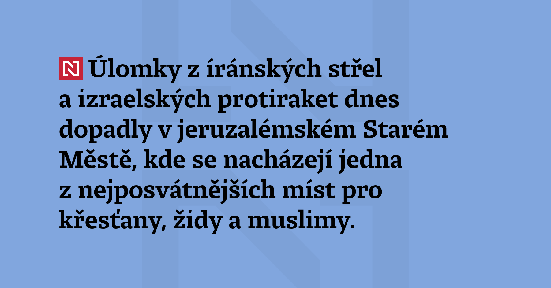 Úlomky z íránských střel a izraelských protiraket dnes dopadly v jeruzalémském Starém Městě, kde se nacházejí jedna z nejposvátnějších míst pro křesťany, židy a muslimy. S odkazem na izraelskou policii o tom napsala agentura Reuters. Při úderech nebyl nikdo zraněn a nebyly hlášeny škody na chrámě Božího hrobu ani na Chrámové hoře. Chrámová hora, které muslimové říkají Haram aš-Šaríf (Vznešená svatyně), leží na […]