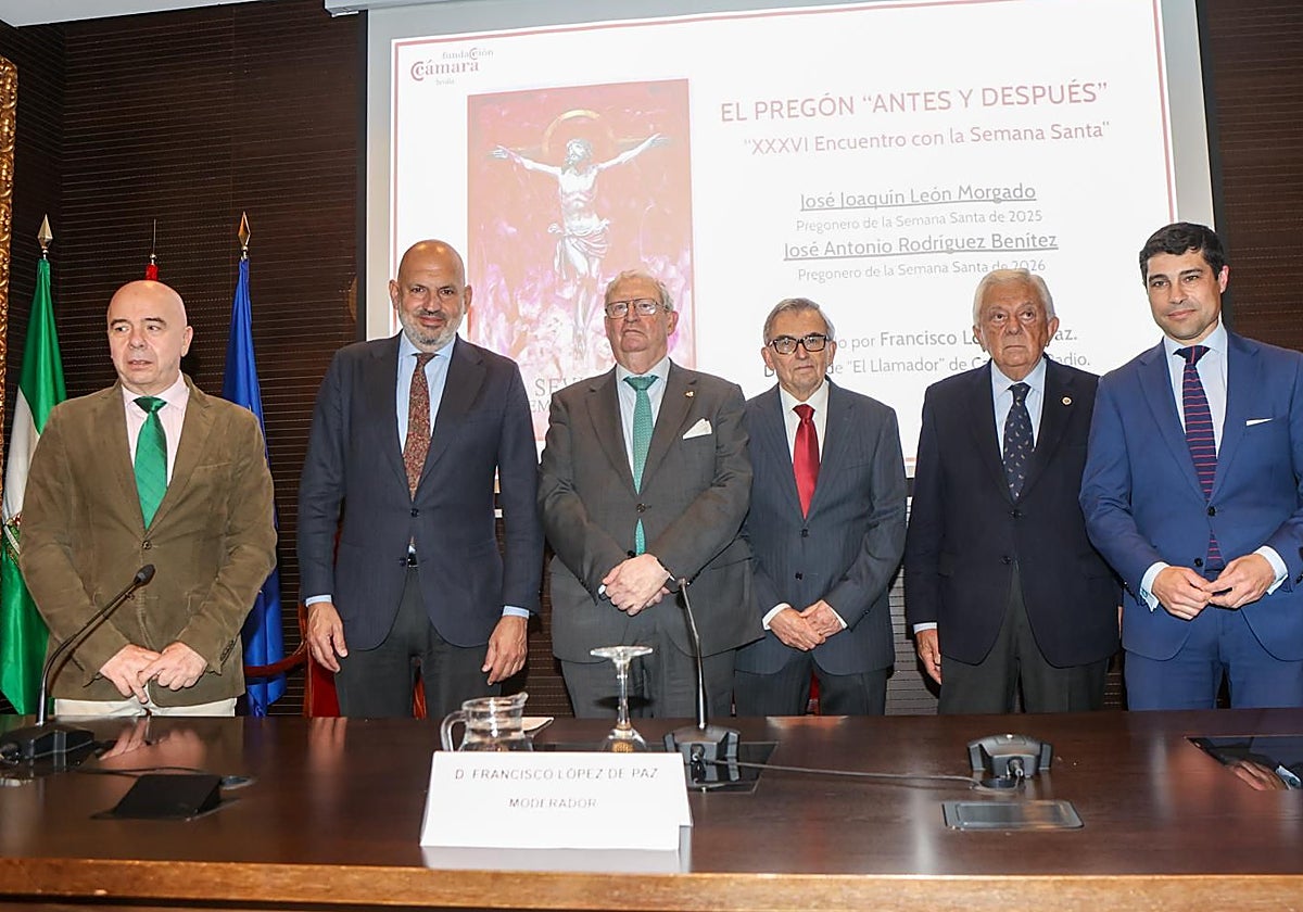 La Fundación Cámara de Comercio acogió este lunes por la noche, como cada año en la semana de vísperas del Pregón de la Semana Santa de Sevilla –y ya van treinta y seis– el tradicional acto titulado 'El pregón antes y después '. La mecánica es sencilla: se trata de un encuentro previo a la Semana Santa en el que el pregonero saliente y el entrante charlan y cuentan sus impresiones acerca del acto del domingo de Pasión en el Teatro de la Maestranza y todo lo que lo rodea. De esta forma, el pregonero de este año, el periodista y colaborador de ABC José Antonio Rodríguez , y su predecesor, el también periodista José Joaquín León , protagonizaron un... Ver Más