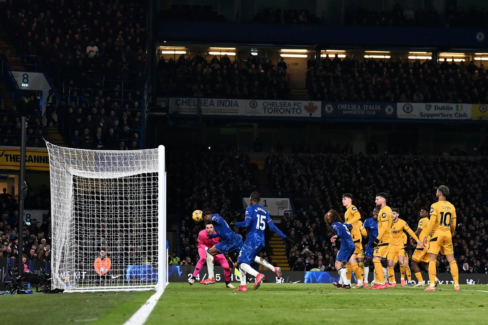 LONDON, ENGLAND - JANUARY 20: Jose Sa of Wolverhampton Wanderers fails to stop Noni Madueke of Chelsea from scoring his team's third goal during the Premier League match between Chelsea FC and Wolverhampton Wanderers FC at Stamford Bridge