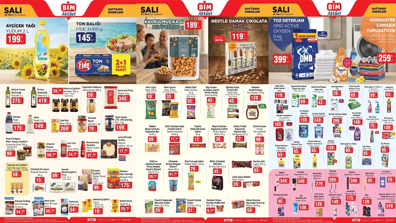 BİM, 24 Mart 2026 Salı günü gıda ürünlerinde dev fırsatlar sunuyor. Kampanya günü mağazalara uğrayanlar, indirimli ürünlerle dolu raflarda avantajlı alışverişin keyfini çıkaracak.