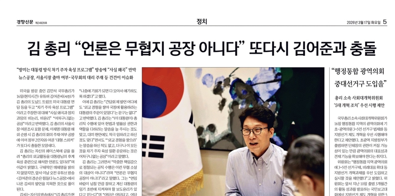 1) 김어준이 한마디하자 뉴욕에서 받아친 김민석 유튜브 방송인 김어준이 자신의 채널에서 김민석 국무총리의 미국 방문을 "이재명 대통령 방식의 차기 주자 육성 프로그램"이라고 논평하자 미국에 있던 김민석이 그렇지 않다고 반박했다. 지난 12일 미국에 도착한 김민석은 워싱턴에서 J.D. 밴스 부통령을 면담한 데 이어 이튿날 도널드 트럼프 대통령과 깜짝 만남을 가져 언론의 주목을 받았다. 김어준은 16일 오전 '김어준의 겸손은 힘들다 뉴스공장'에서 "왜 총리가 50일밖에 안 됐는데 또 미국에 갔느냐"며 "대통령 방식의 차기 주자 육성 프로그램의 일환으로 해석한다"고 말했다. 그러자 오후 3시경(미국 뉴욕시간 새벽 2시) 김민석은 페이스북에 "총리의 외교활동을 대통령님의 후계육성 훈련으로 해석한 언론도 있더라"며 "(대통령이) 대미현안에 적극 임하라고 하신 건 맞지만 (기자) 간담회 발언 어디에도 '외교 경험을 쌓아 국정에 활용하라는 대통령의 주문이 있었다'는 문구는 없다"고 반박했다. 그는 "쓰다보니 어느새 뉴욕 새벽 2시"라며 "막중한 책임감으로 점철되는 공직 수행은 이런 무협소설의 대상이 아니다. 언론은 무협지 공장이 아니다"라고 일갈했다. 이어서 "보수든 진보든 기본 윤리는 같다", "야당은 야당답고, 여당은 여당답고, 언론은 언론다워야 한다"고도 했다. 국무총리가 임기 중 두 차례 미국을 찾은 것은 이례적이지만, 총리가 자신에 대한 유튜브 논평에 대해 출장 중 현지에서 반박한 것 역시 이례적이다. 김민석은 같은 날 뉴욕 주유엔대표부에서 총리실 간부들이 모두 참여하는 회의를 원격 주재했는데, 동아일보는 "총리 해외 순방 중 화상으로 간부 회의를 주재한 것은 처음"이라고 전했다. 두 사람의 충돌은 이번이 처음이 아니다. 지난 1월 여론조사 업체 '여론조사꽃'이 김민석을 서울시장 후보 적합도 조사에 포함하자, 총리실은 "매우 심각한 유감"을 표했다. 이달 5일에도 김어준이 방송에서 이 대통령의 필리핀·싱가포르 순방 때 "(중동위기 상황에) 대응하는 (총리의) 국무회의가 없었다"고 주장하자 총리실이 반박자료를 냈다. 한 시민단체가 김어준을 명예훼손 혐의로 고발하자 김민석이 처벌을 원치 않는다는 입장을 내기도 했다. 2) 여당에 확산되는 '김부겸 차출설' 민주당에서 김부겸 전 국무총리의 대구시장 출마설이 확산되고 있다. 최근 미국에서 귀국한 김부겸은 주변에 "조만간 출마 여부를 결정하겠다"고 말한 것으로 알려졌다. 정청래 민주당 대표는 16일 국회에서 열린 시도당위원장협의회 연석회의에서 "선거는 전략이기 때문에 1%의 예외가 있으면 정무적 판단 사안"이라며 대구를 언급했다. 그러면서 "저분을 영입하면 후보를 낼 수 있을 것 같은데 공천 신청이 끝났다는 경우가 뒤늦게 발견되면, 정무적 판단하에 공천 신청을 접수하고 경선하게 해야 한다", "당의 승리 등 여러 상황을 고려해 판단하기 애매할 경우 지도부에 넘겨주면 결정하겠다"고 말했다. 현재 민주당 대구시장 후보 신청자가 없는 상태에서 김부겸의 차출 가능성을 얘기한 것으로 해석된다. 앞서 후보로 거론되던 홍의락 전 의원은 "대구 민심이 김부겸을 원한다"며 불출마를 선언했다. 민주당은 이번 지방선거에서 야당세가 강한 경북을 제외한 16개 시도지사직 석권을 목표로 하고 있다. 당내에서는 대통령 국정 지지도가 연일 최고치를 경신하는 만큼, 김부겸이 나설 경우 창당 이후 처음으로 대구시장을 배출할 수 있다는 기대감도 커지고 있다. 김부겸은 2014년 대구시장 선거에서는 40.3% 득표율로 낙선했지만, 2년 뒤 총선에서는 대구 수성갑에서 62.3%의 득표율로 당선된 바 있다. 당 안팎에서는 조만간 지도부가 김부겸을 만나 출마를 공식 요청할 것이라는 관측이 나온다. 전체 내용보기