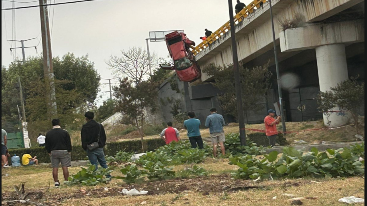 Un auto quedó colgando del borde del Periférico Ecológico en Puebla tras un fuerte accidente. ¿Hay personas atrapadas? Cuerpos de emergencia ya en el lugar.