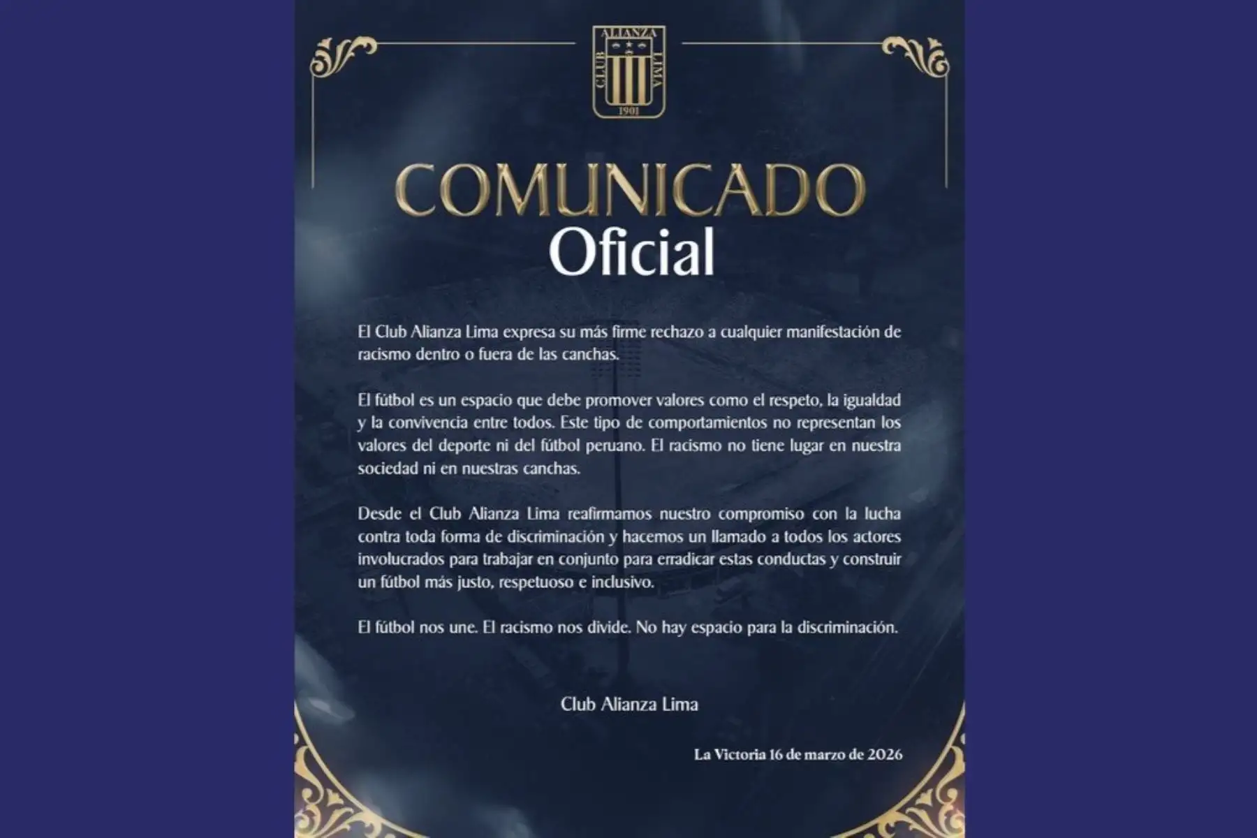 El Club Alianza Lima expresó este lunes “su más firme rechazo a cualquier manifestación de racismo dentro o fuera de las canchas”, mediante un comunicado oficial difundido en redes sociales.