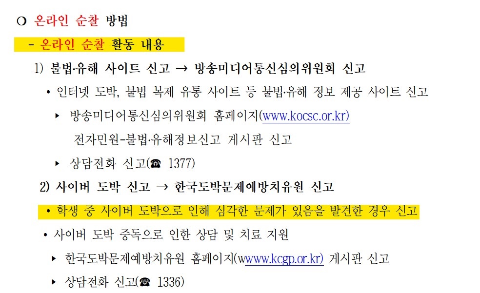 광주시교육청이 학교별로 초중고 학생 5명씩 모두 1900여 명을 뽑아 사이버 방범단을 만든 뒤, 유해 사이트와 도박 학생을 신고토록 순찰을 돌릴 예정인 것으로 확인됐다. '학생들에게 사이버 완장을 채워 온라인 감시단을 운영하는 것은 비교육적'이라는 지적이 나온다. "1900명 뽑아 순찰 활동, 학생 중 사이버 도박 발견하면 신고" 17일, <오마이뉴스>는 광주시교육청이 이 지역 초중고에 일제히 보낸 '학생 사이버 방범단 운영 계획' 문서를 살펴봤다. 이 문서에서 광주시교육청은 "방범단은 사이버폭력과 도박 예방·근절을 위해 운영하는 사이버폭력 예방 조직"이라면서 오는 4월 8일 방범단 발대식을 열 예정이다. 초중고마다 5명씩을 추천받고 초중고 각각 10개교에서는 사이버 방범단 동아리도 운영할 수 있도록 운영비를 지원한다. 문제는 이 방범단 학생들에게 사이버 순찰을 시키고 학생을 신고토록 한다는 것이다. 교직원과 경찰이 해야 할 일 가운데 일부를 학생에게 맡기겠다는 것이다. 전체 내용보기