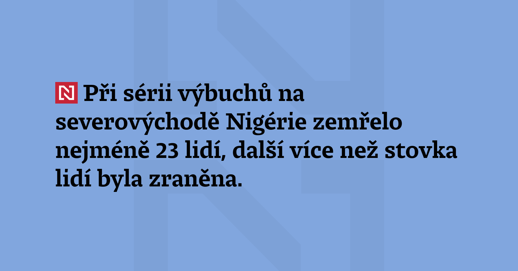 Při sérii výbuchů na severovýchodě Nigérie zemřelo nejméně 23 lidí, další více než stovka lidí byla zraněna. Policie případ šetří jako možný bombový útok. (Reuters)