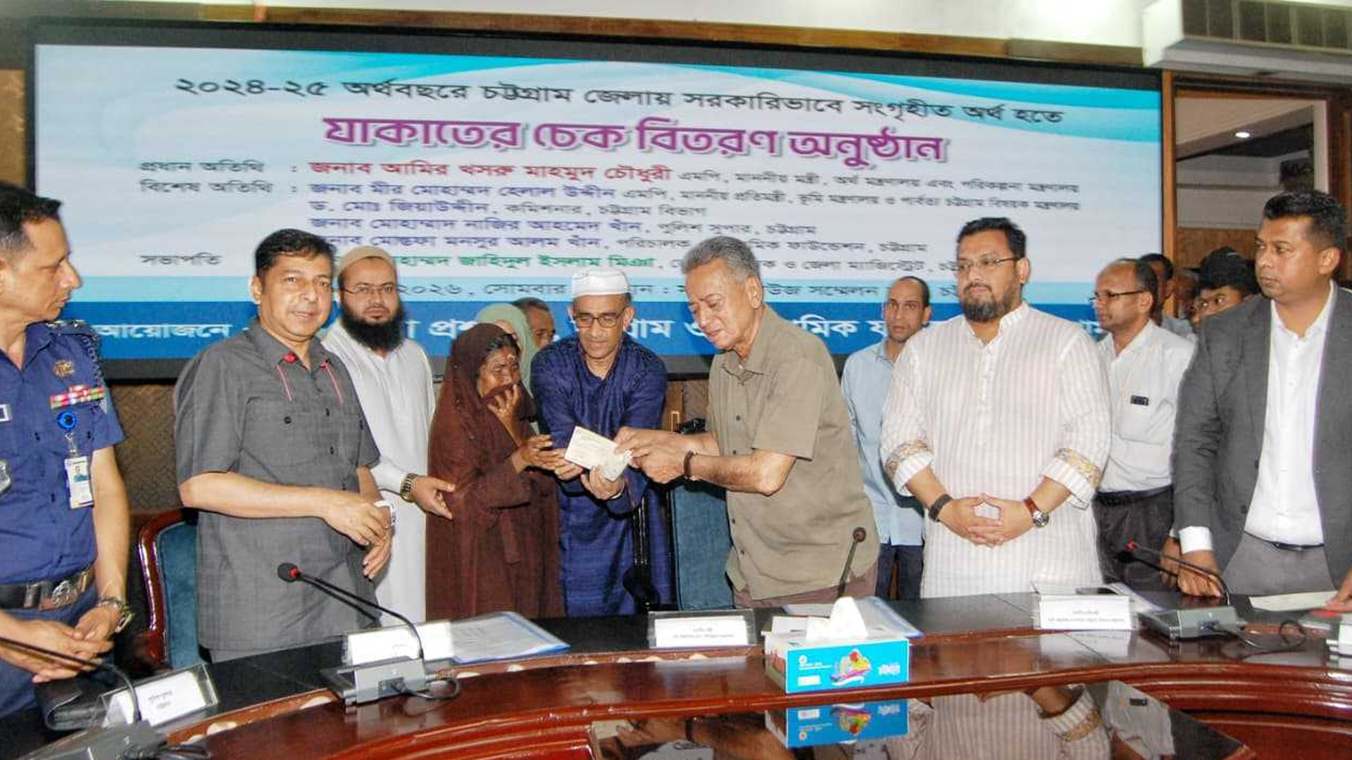 চট্টগ্রামে সরকারি যাকাত ফান্ডের চেক বিতরণ করেছেন অর্থ ও পরিকল্পনা মন্ত্রী আমির খসরু মাহমুদ চৌধুরী।সোমবার (১৬ মার্চ) বিকেলে চট্টগ্রামের সার্কিট হাউসে এ চেক বিতরণ করা হয়।এ বছর ২০২৪-২৫ অর্থ বছরে চট্টগ্রাম জেলায় যাকাত দেয়া হচ্ছে ৯২ লাখ ১১ হাজার ৩৭২ টাকা। ১০ হাজার টাকা করে ১৬টি উপজেলা ও মহানগরের ৬টি জোনের ৯২১ জনকে দেয়া হয়। পরে অর্থমন্ত্রী অসহায় ও দুস্থ পরিবারের মাঝে চেক হস্তান্তর করেন।অর্থমন্ত্রী বলেন, ‘যাকাতের মাধ্যমে সমাজ থেকে ধনী দরিদ্রদের বৈষম্য দূর করা সম্ভব। আর অর্থনৈতিক বৈষম্য দূরীকরণের গুরুত্বপূর্ণ অবদান রাখে যাকাত।’যাকাত বিতরণ অনুষ্ঠানে উপস্থিত ছিলেন ভূমি প্রতিমন্ত্রী মীর মোহাম্মদ হেলাল উদ্দিন।আরও পড়ুন: কর্পোরেট যাকাত হিসাব ও শরিয়াহ কমপ্লায়েন্স নিশ্চিতকরণে সেমিনার অনুষ্ঠিতপ্রতিমন্ত্রী বলেন, ‘সবাইকে যাকাত দানে উদ্বুদ্ধ করতে হবে। যাকাত গরীব মানুষের হক। যাকাত সুষ্ঠুভাবে বণ্টন করতে হবে।’চট্টগ্রামে জেলা প্রশাসন ও ইসলামিক ফাউন্ডেশনের আয়োজনে যাকাত ফান্ডের টাকা বিতরণ অনুষ্ঠানে যাকাতের গুরুত্ব তুলে ধরে বক্তারা বলেন, যাকাত ধনীদের ওপর গরিবের হক। ধনীর সম্পদকে পবিত্র করে যাকাত। সবাইকে যাকাত দানে উদ্বুদ্ধ করতে হবে।চেক বিতরণ অনুষ্ঠানে জেলা প্রশাসক জাহিদুল ইসলাম মিঞা, বিভাগীয় কমিশনার মোহাম্মদ জিয়াউদ্দীন ও ইসলামিক ফাউন্ডেশন পরিচালক উপ-পরিচালক ফাহমিদা বেগমসহ অন্যরা উপস্থিত ছিলেন।এবার চট্টগ্রাম জেলায় যাকাত দেয়া হবে ৯২ লাখ ১১ হাজার ৩৭২ টাকা। জনসংখ্যানুপাতে ১০ হাজার টাকা করে ১৬টি উপজেলা ও মহানগরের ৬টি জোনের ৯২১ জনকে যাকাত দেয়া হবে।