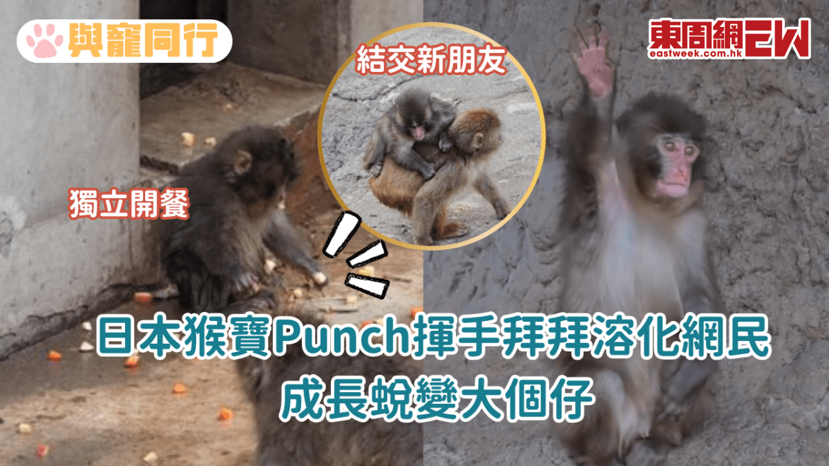 全球爆紅的日本小獼猴「Punch君」近日傳來好消息,由當初要靠猩猩公仔寄託母愛,到今日學會揮手送客、結交了新的小猴子朋友每一幕都令網民看到眼濕濕。近日,Punch君再次憑一段隔住玻璃向遊客揮手「拜拜」的短片,在網絡瘋傳逾百萬次! 靈性揮手 承載千萬寵愛 Punch君天生聰穎、學習能力強,現時是園內的「大明星」。一段短片再度引發網絡騷動,當園區響起「即將關閉,請安全回家」的廣播時,正在玻璃窗前的Pu