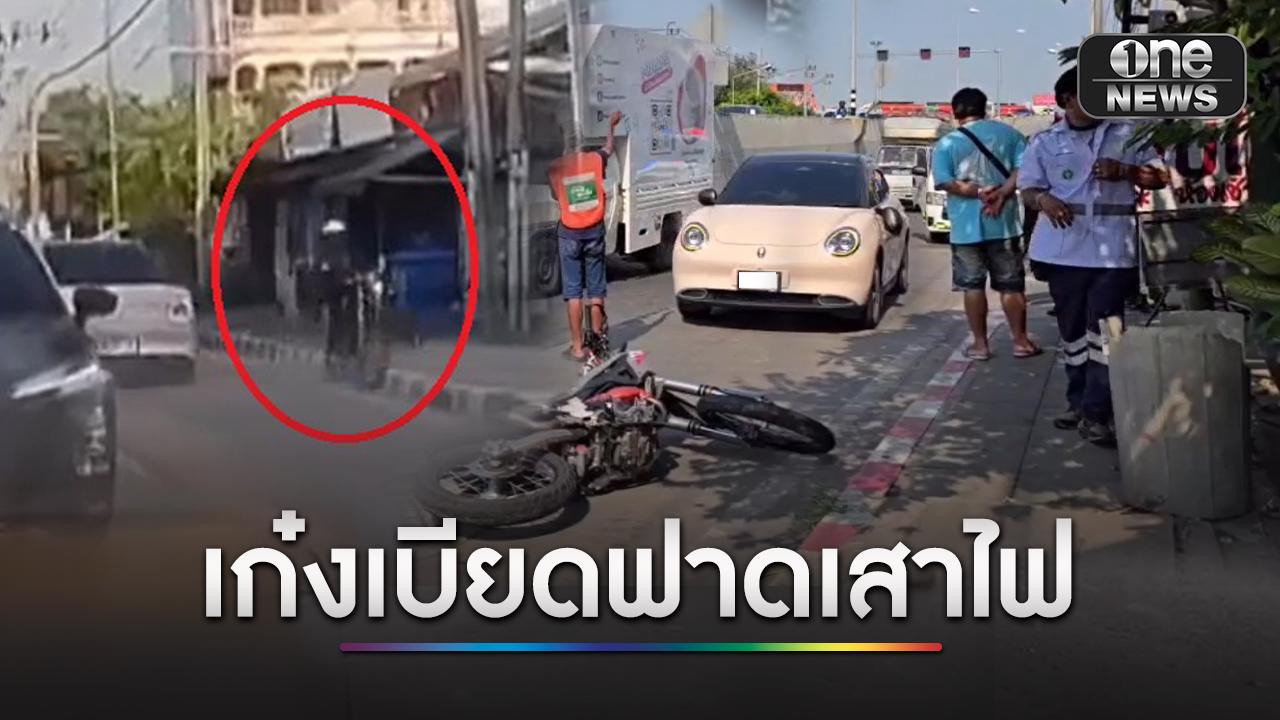 หญิงขับเก๋งกลับจากส่งลูกที่โรงเรียนมุ่งหน้ากลับบ้าน เปลี่ยนเลนหนีรถติด เฉี่ยว จยย.กูรูรถยนต์ เสียหลักฟาดเสาไฟดับ...