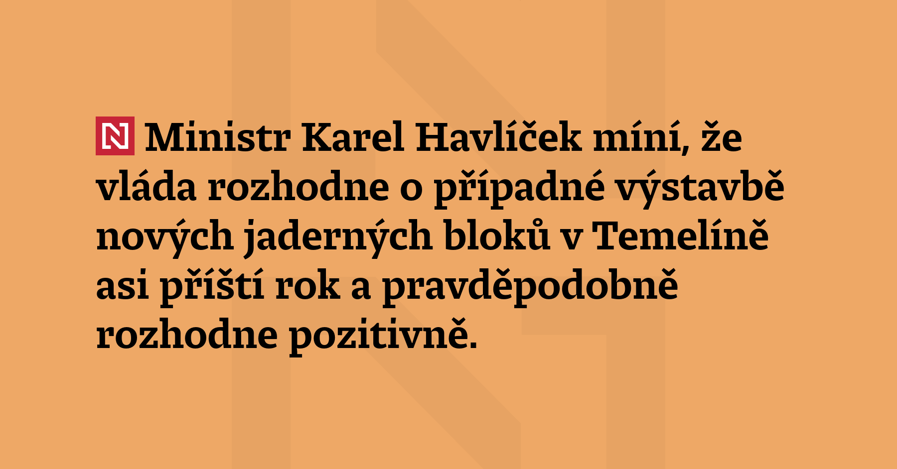 Ministr Karel Havlíček míní, že vláda rozhodne o případné výstavbě nových jaderných bloků v Temelíně asi příští rok a pravděpodobně rozhodne pozitivně. (ČTK)