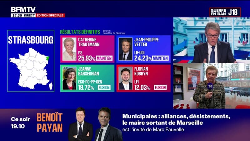 Face à la fusion des listes Les Ecologistes et LFI menée par la maire sortante de Strasbourg Jeanne Barseghian, Catherine Trautmann, arrivée en tête du premier tour des municipales, a noué mardi un accord avec le candidat de centre-droit, s'attirant les foudres du PS. "Cet accord à Strasbourg place ceux qui l'ont conclu en dehors du Parti socialiste", a réagi le premier secrétaire du PS Olivier Faure sur X.