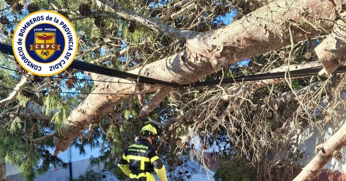 Cae un árbol de grandes dimensiones en Chiclana y un poste de telefonía es golpeado por un camión