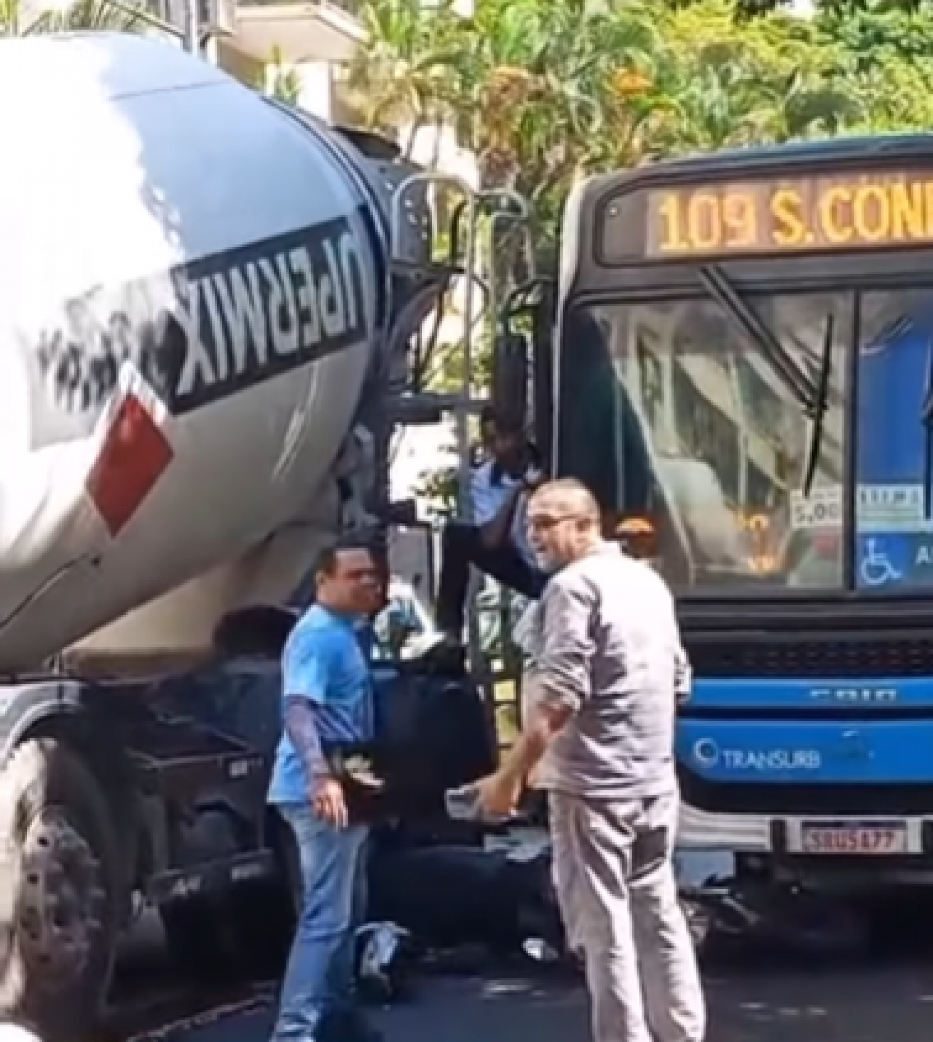 Acidente entre caminhão, ônibus e moto deixa mulher em estado grave
