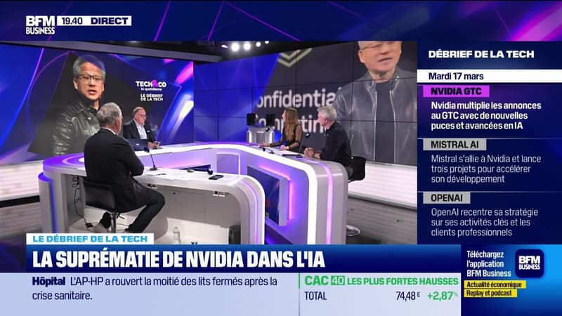 Ce mardi 17 mars, François Sorel a reçu Claudia Cohen, journaliste chez Bloomberg, Frédéric Krebs, président de Krebs & Partners, et Frédéric Simottel, journaliste BFM Business. Ils se sont penchés sur les annonces de Nvidia sur les nouvelles puces et les avancées en IA lors du GTC, et la collaboration de Mistral avec Nvidia pour accélérer son modèle, dans l'émission Tech & Co, la quotidienne, sur BFM Business. Retrouvez l'émission du lundi au jeudi et réécoutez la en podcast.